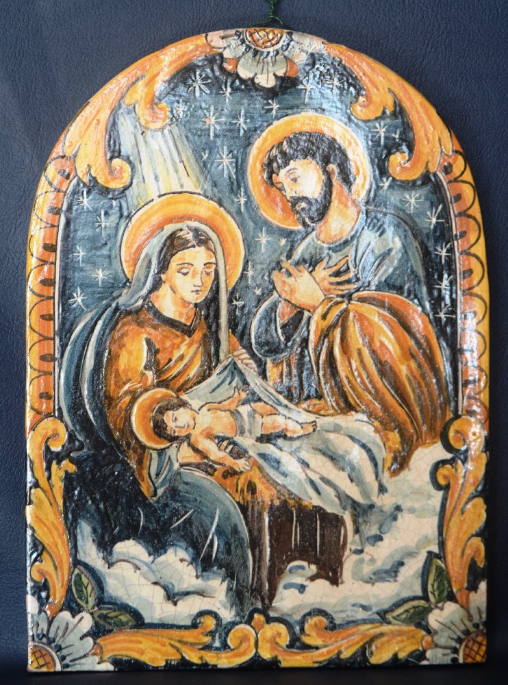 Sicilian majolica plaque painted with a Nativity scene, by M DiPietra, 23.5 x 33cm