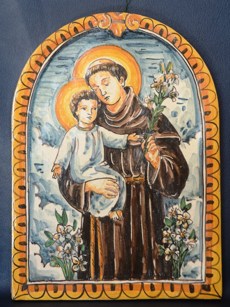Sicilian majolica plaque painted with St Francis, by M DiPietra, 23 x 32cm