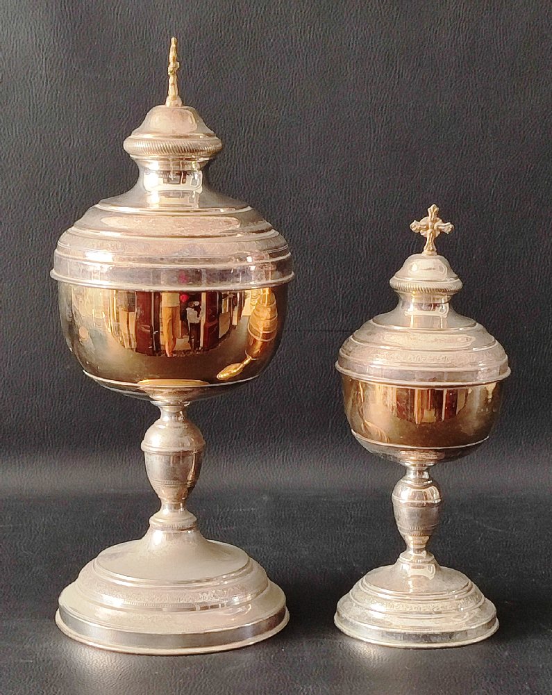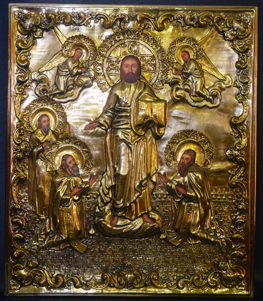 Silver oklad icon with rich embossing, with saints and angels, 45 x 52cm