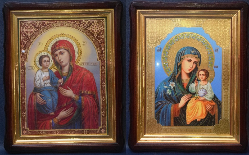 2 Gilted and decorated icons of the Virgin and Child in a serpentine and gilt case, 40 x 49cm