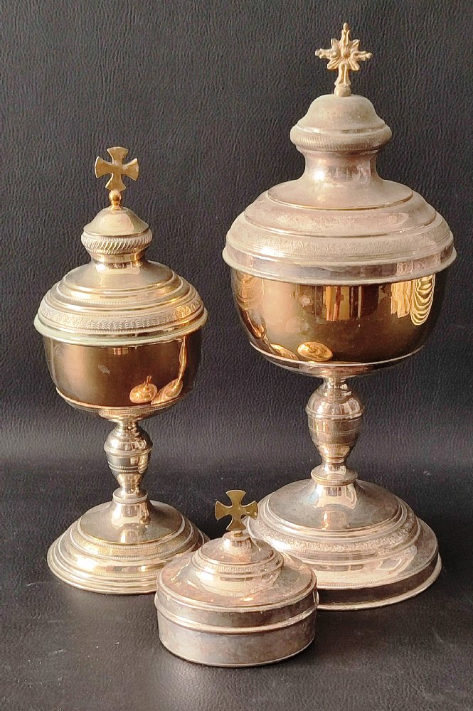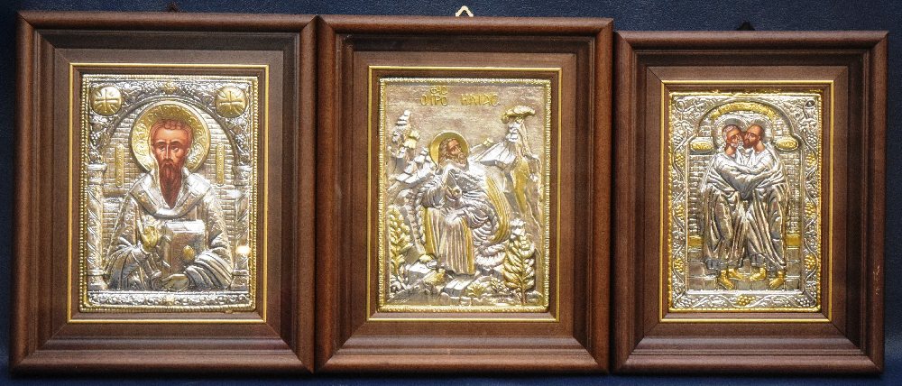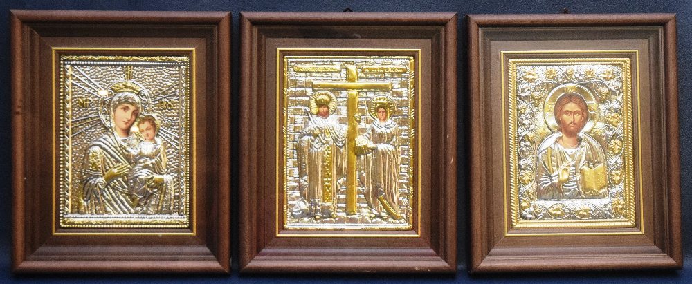 Silver oklad set of 3 icons depicting Judas, Jesus in the Desert and an Evangelist, in frames, 23 x 29cm