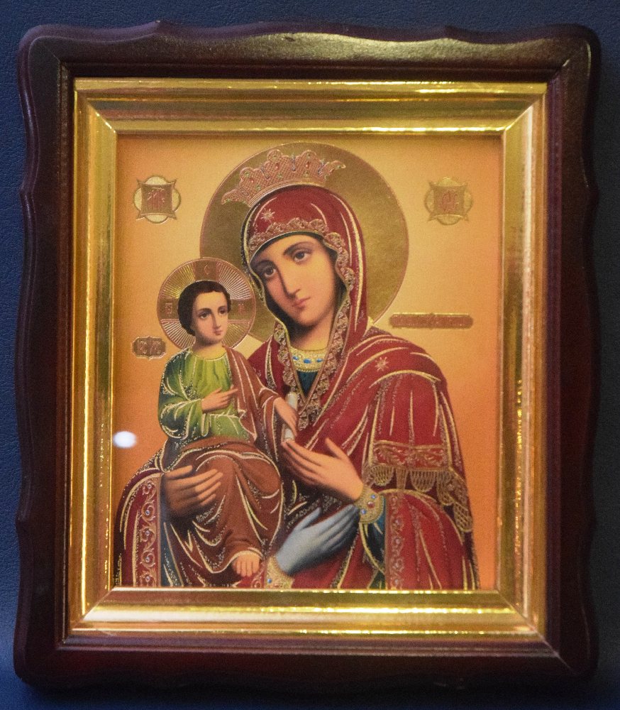 Gilted and decorated icon of the Virgin and Child in a serpentine and gilt case, 28 x 32cm