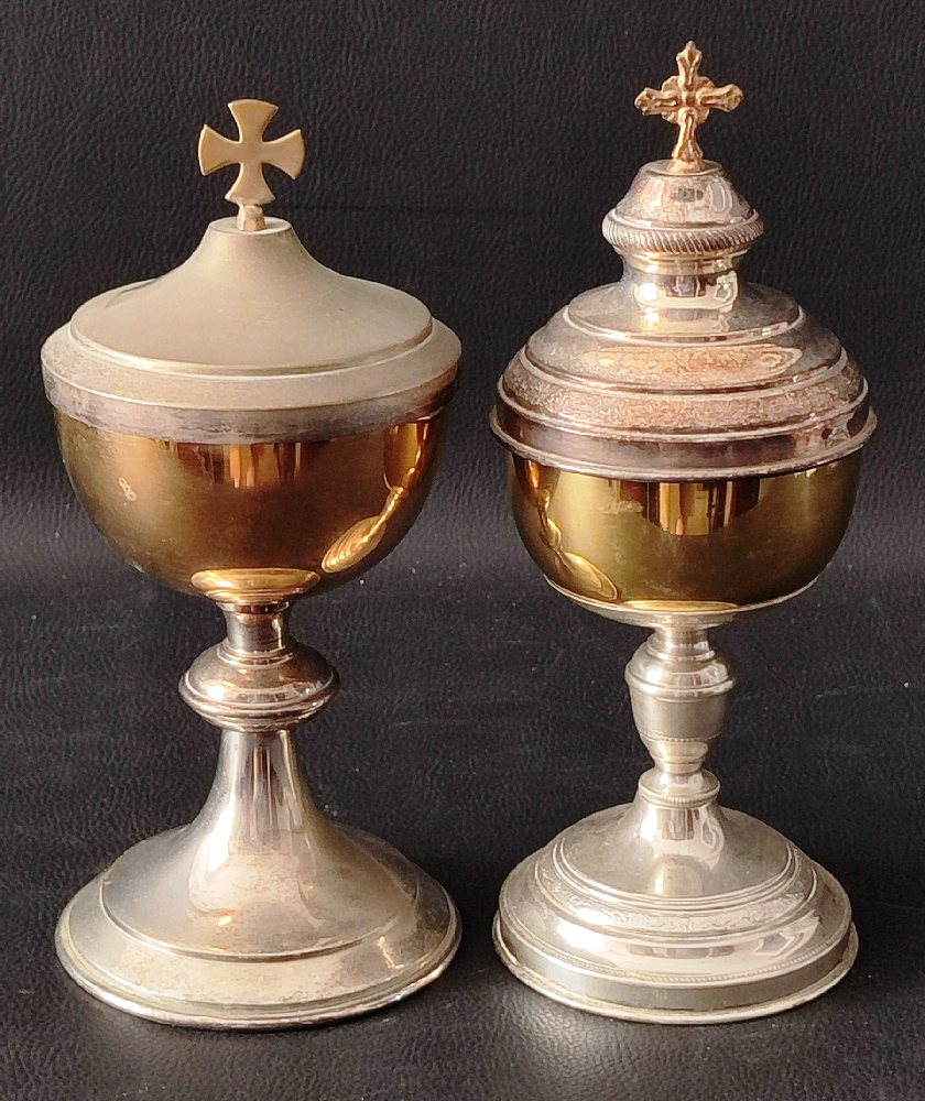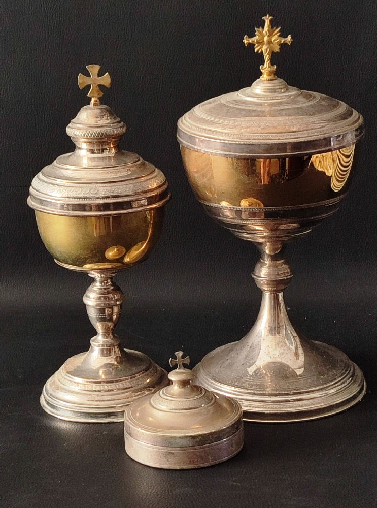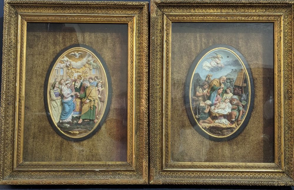 19th C. French plaster pair oval high relief plaques with polychrome decoration depicting ‘The Mystic Marriage’ and ‘The Nativity’ 15 x 23cm, in gilt cases