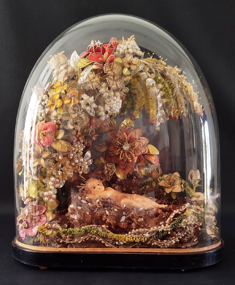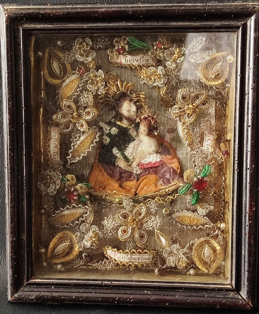 19th C. Wax figure of St. Joseph and Child Jesus set in artificial flower surround, 18x22cms, framed