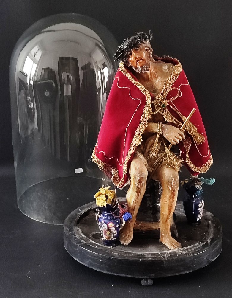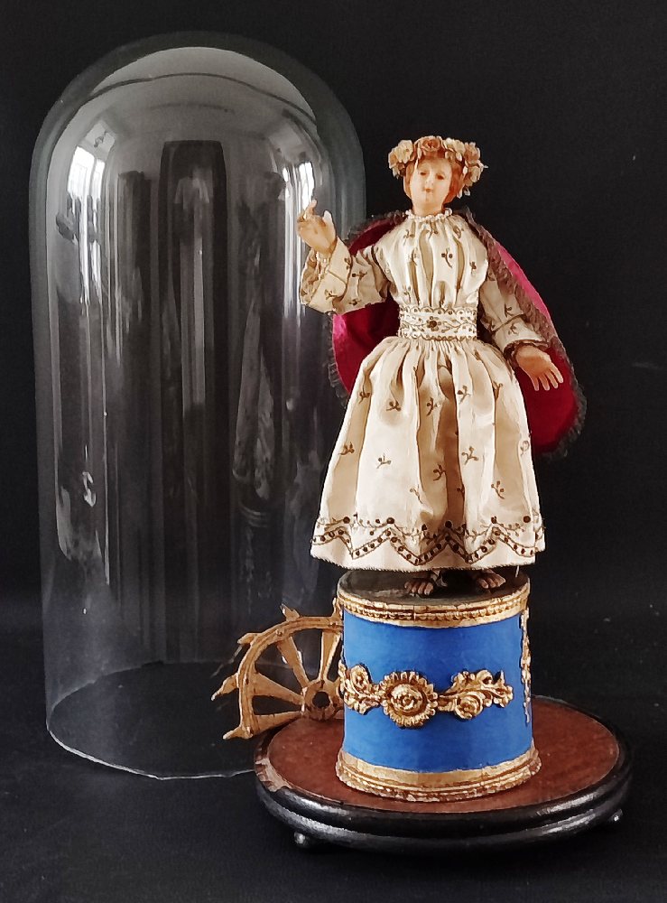 19th C St. Wax figure of St. Catherine 37cms, under glass dome