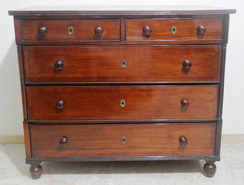 19th C. Mahogany chest of 5 drawers of small proportion, bun feet, marble top