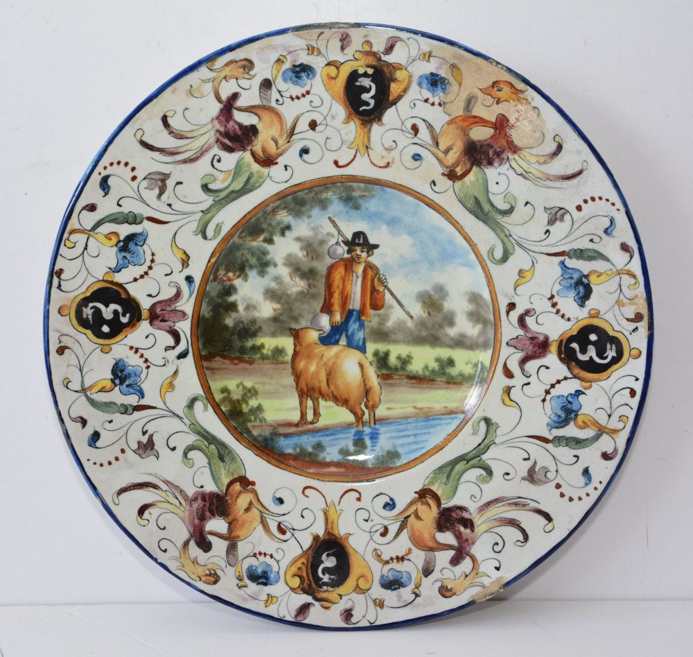 19th C. Italian Castelli majolica round dish decorated with a shepherd in a wide border of grotesques and foliage, 30cms, signed
