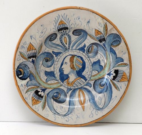 19th C. Faenza majolica round dish painted with a female portrait in a scrolled pattern, 32cm