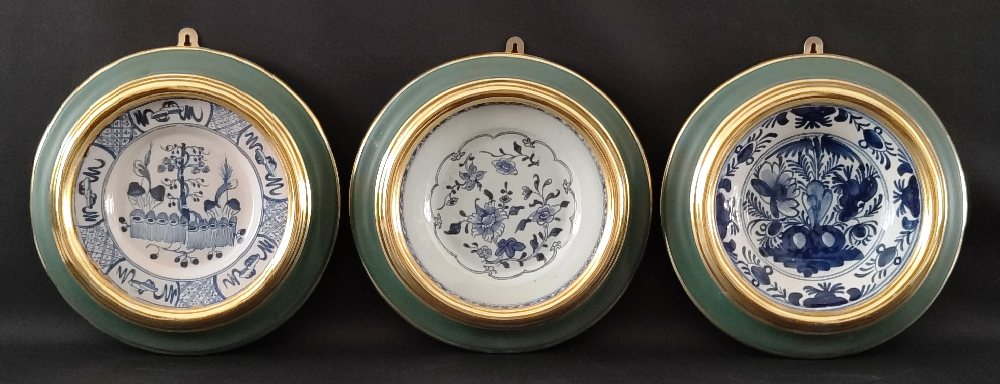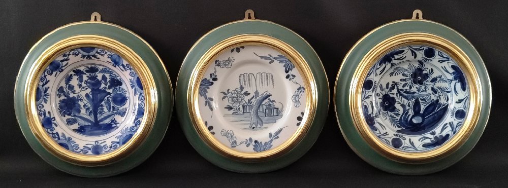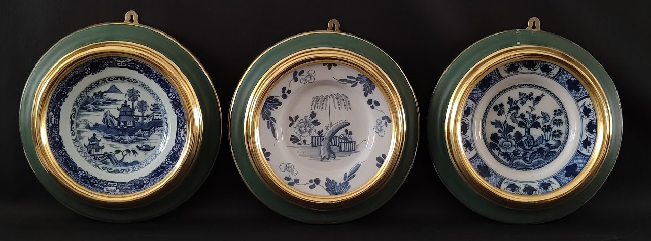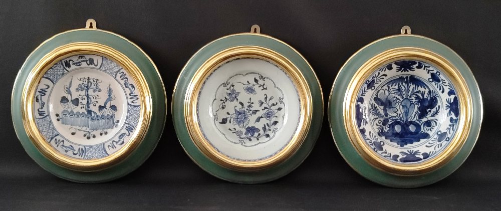 3, 18th C. Chinese porcelain blue & white plates set in green and gilt wood frames