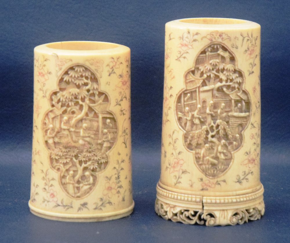 2, Japanese fine carved ivory brush pots, 1 missing base