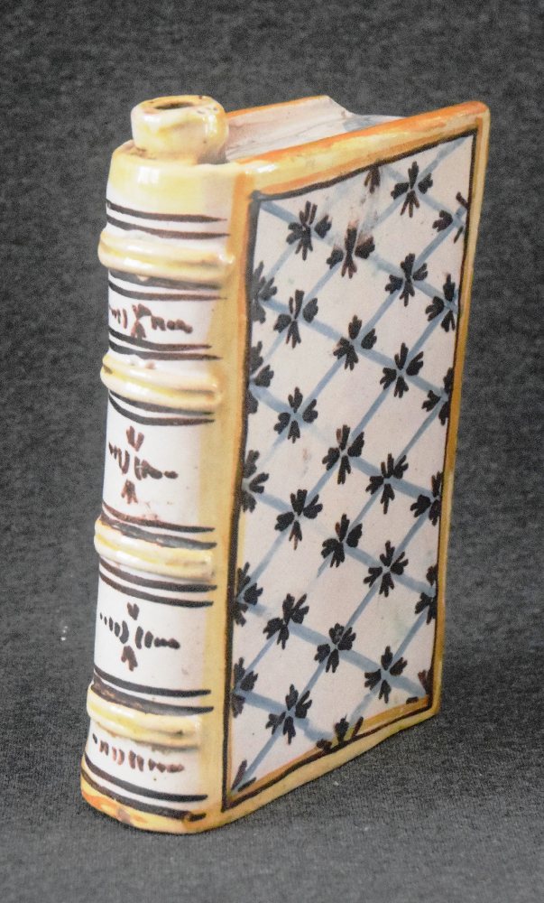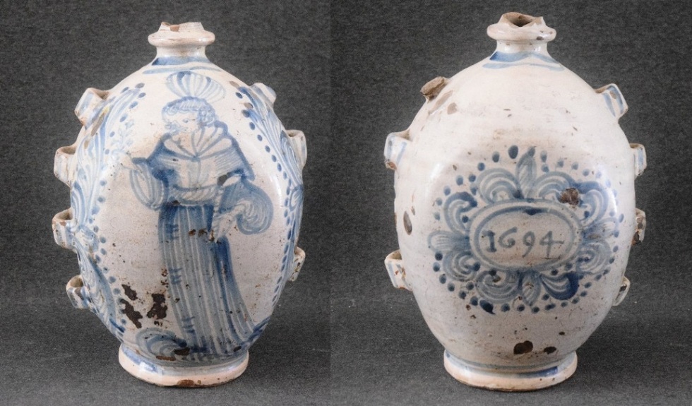 19th C. Majolica water bottle with strap loops, depicting saint (dated 1694), 33cms