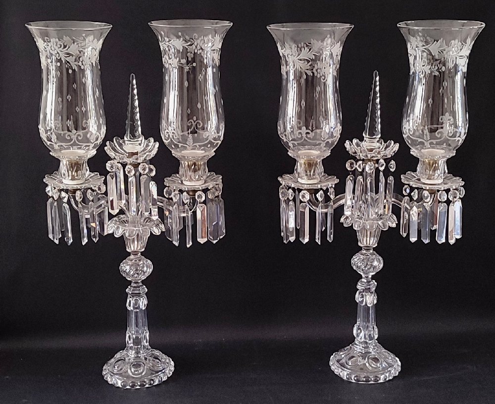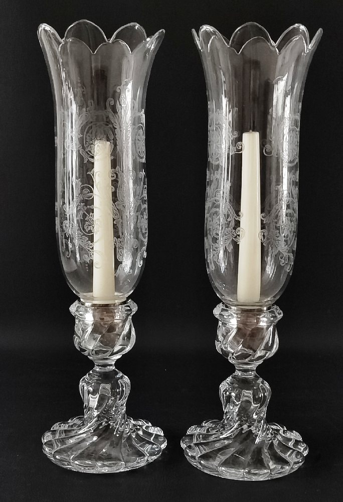 2, 20th C. fine glass candlesticks with engraved glass tall shades