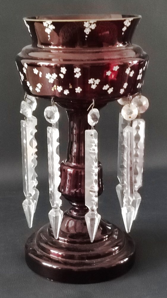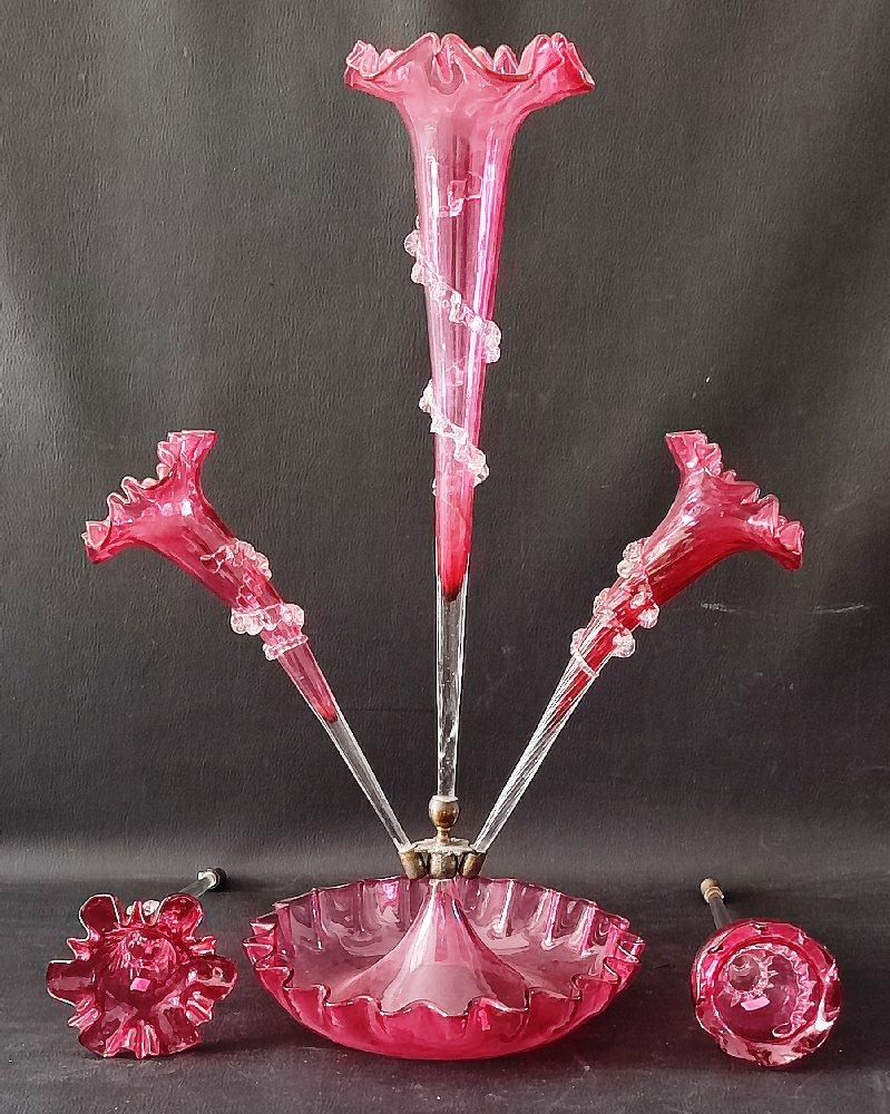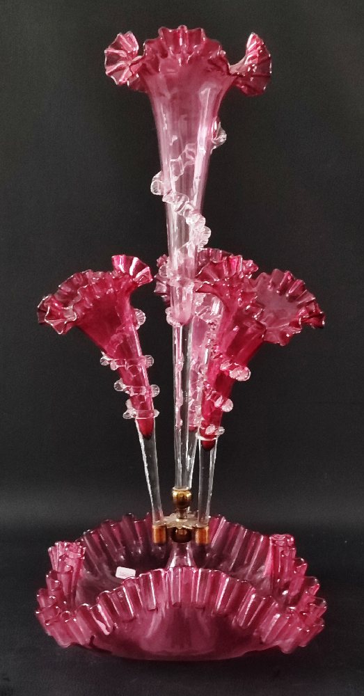 Victorian cranberry glass centre-piece with 4 trumpet flutes