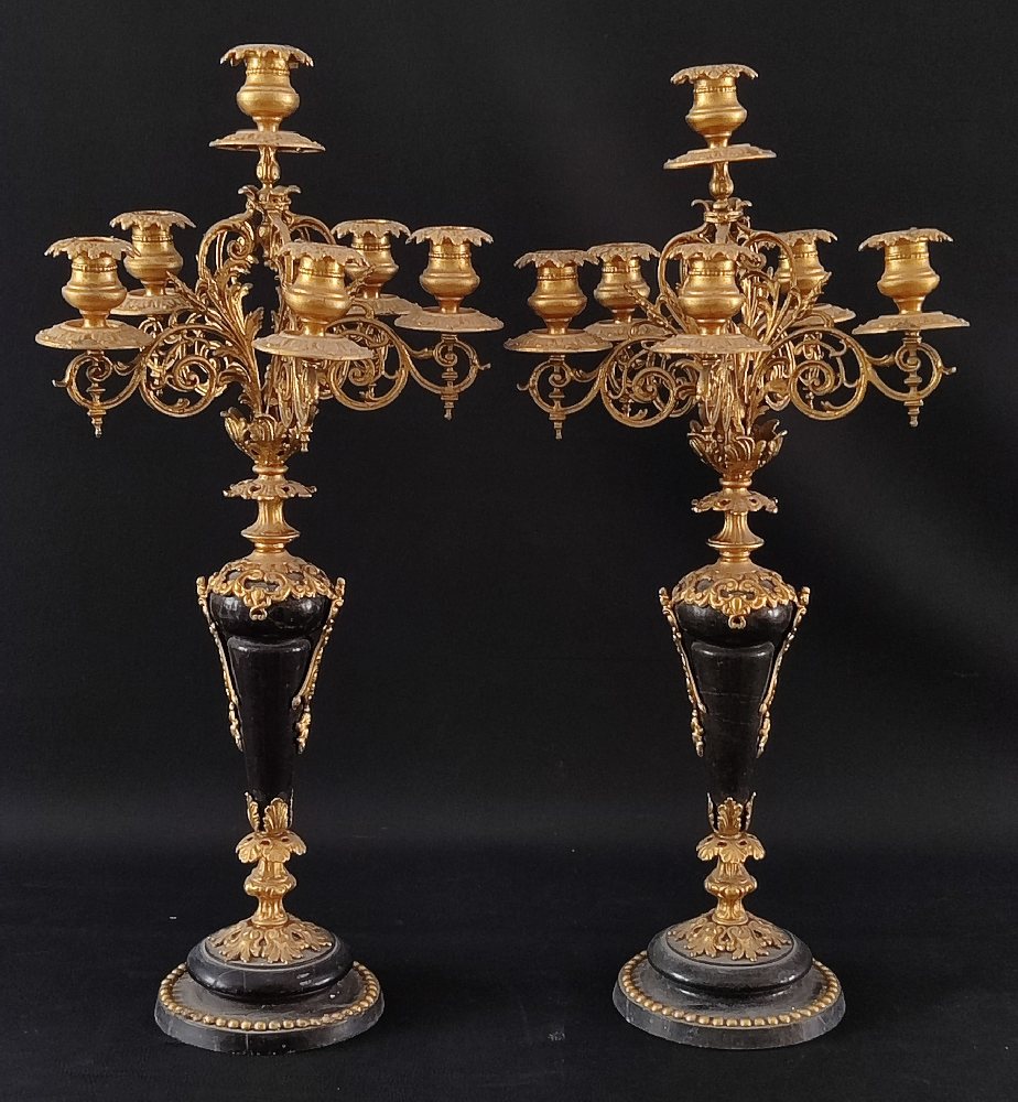 19th C. Pair candelabra, gilt with marble stem and base, 6 branch, 58cms