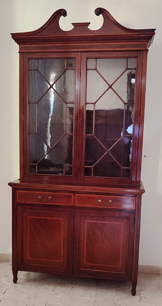 Edwardian fine mahogany inlaid cupboard with 2 door and 2 drawer base with upper 2 door book case with adjustable shelves