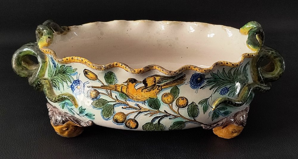 Early 20th C. Cantagalli majolica oval fruit bowl on 4 mask feet, twin handle