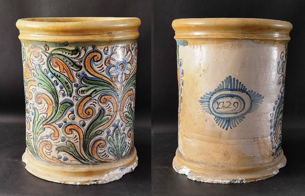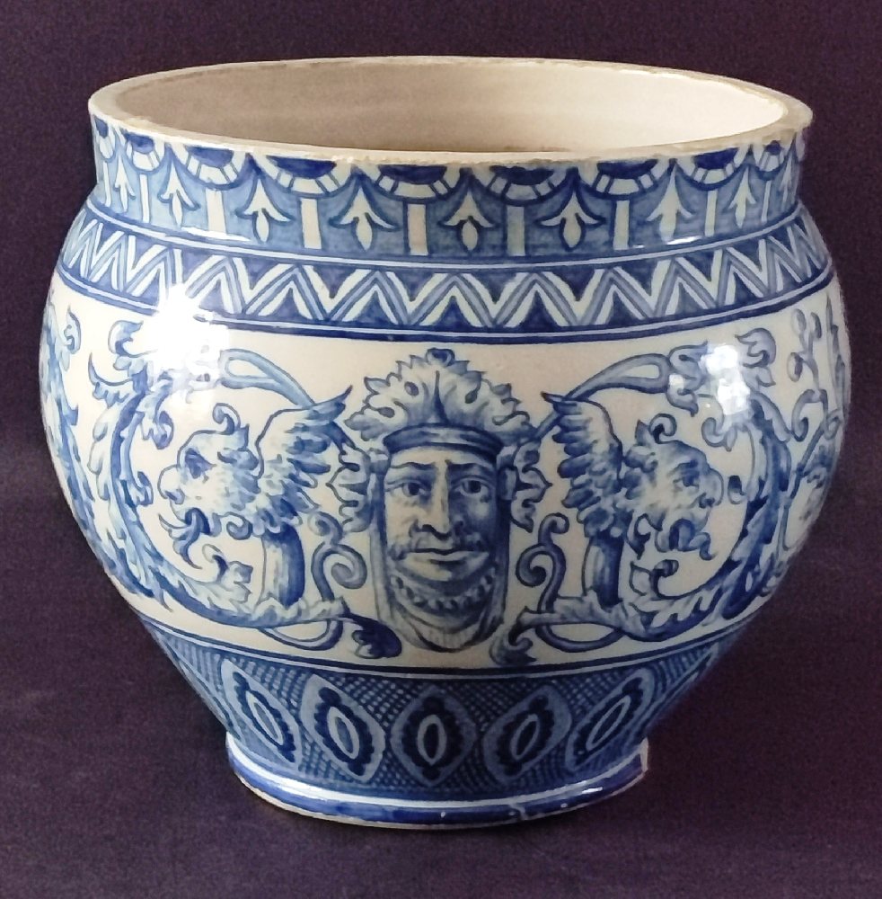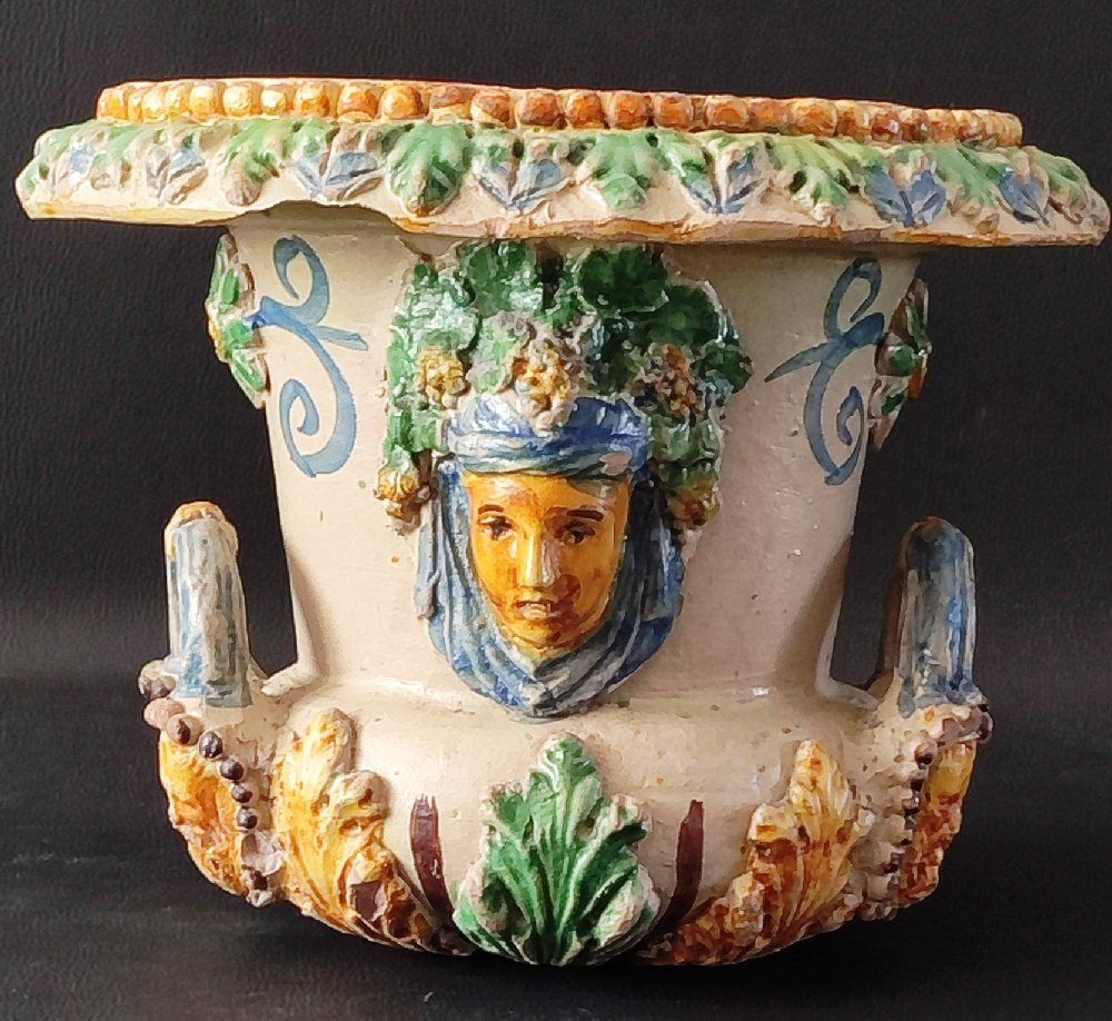 17thn C. Caltagirone majolica planter with applied masks, twin handle