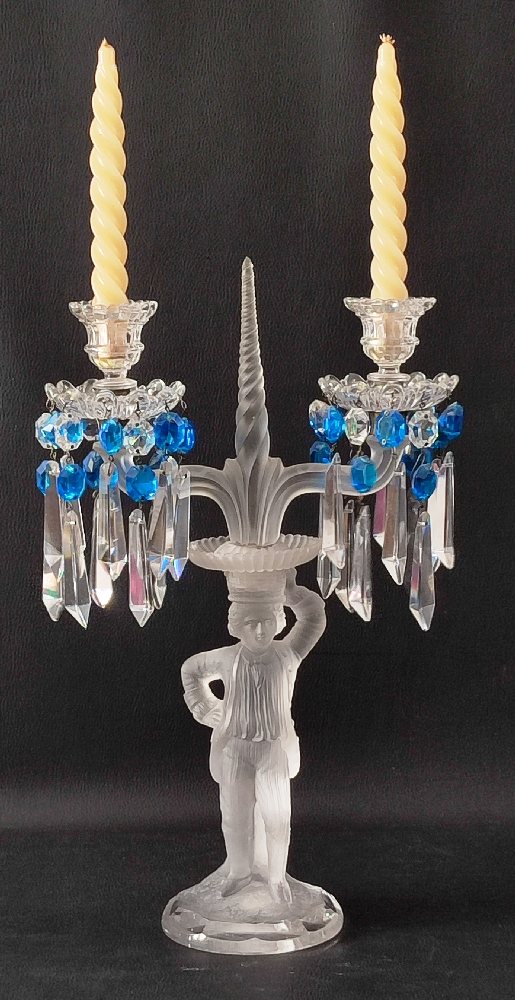 Frosted glass candelabrum with figural stem, and crystal prisms