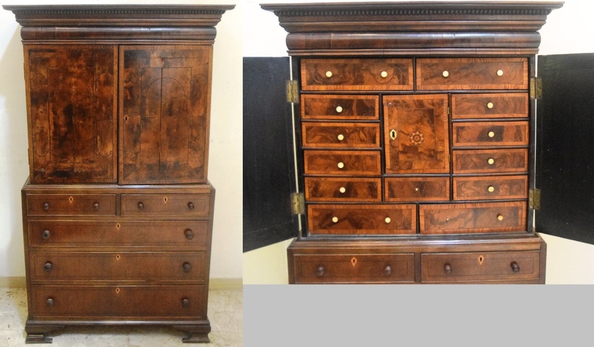 18th C. Dutch burr walnut 2-door cabinet of drawers set on a later chest