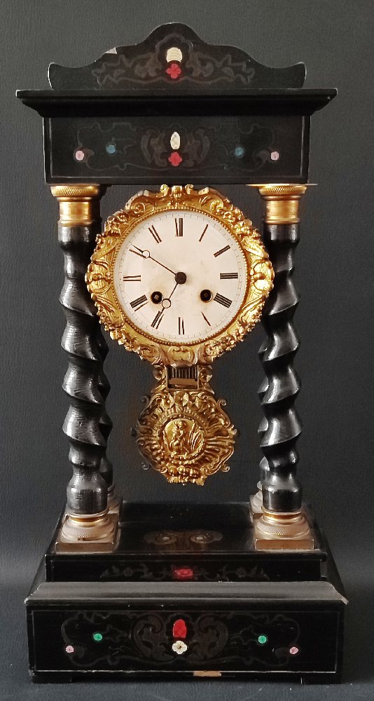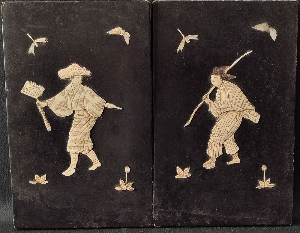 2 Ebonised frames with Oriental figures, bone/ivory and mother of pearl inlay (1d)