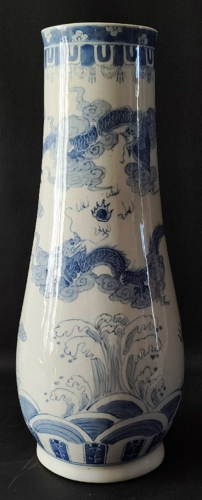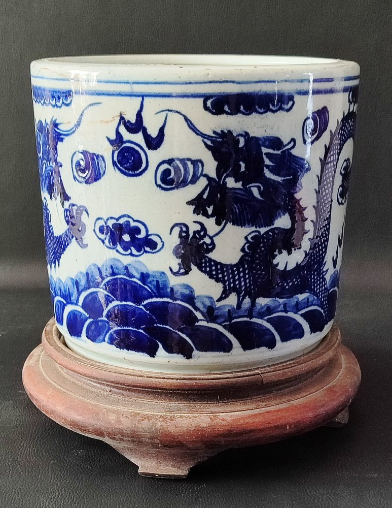 19th C. Chinese blue & white china cylindrical flower pot decorated with ceremonial dragon, on a wood base
