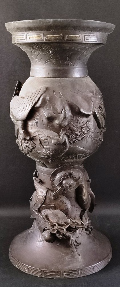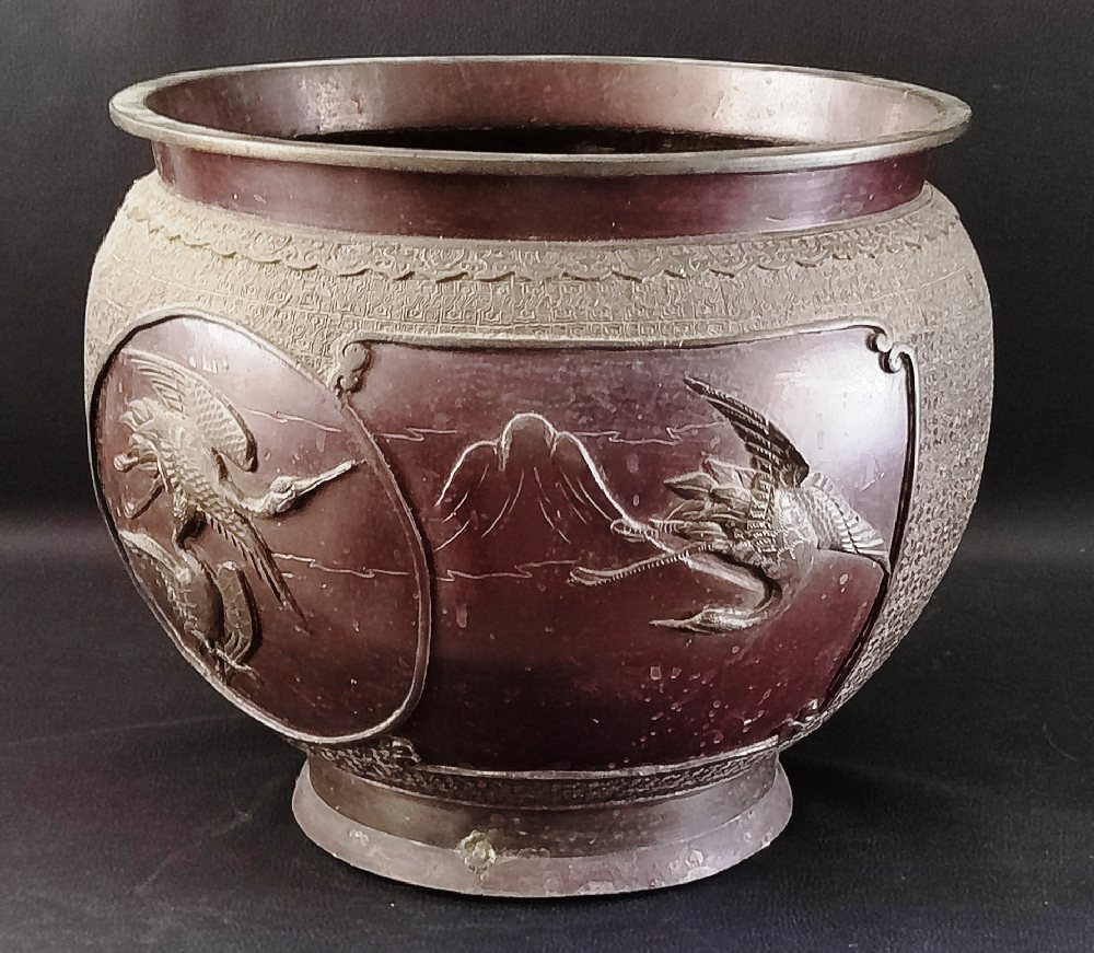 Japanese Meiji period bronze large pot with applied exotic birds, 33cms diameter