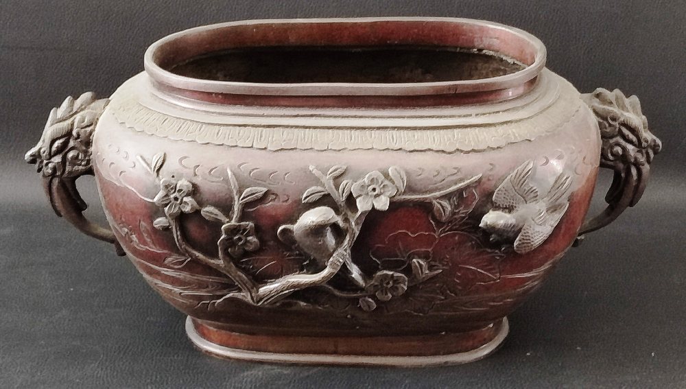 Japanese Meiji period bronze oval pot, twin handle with applied birds and tree branches