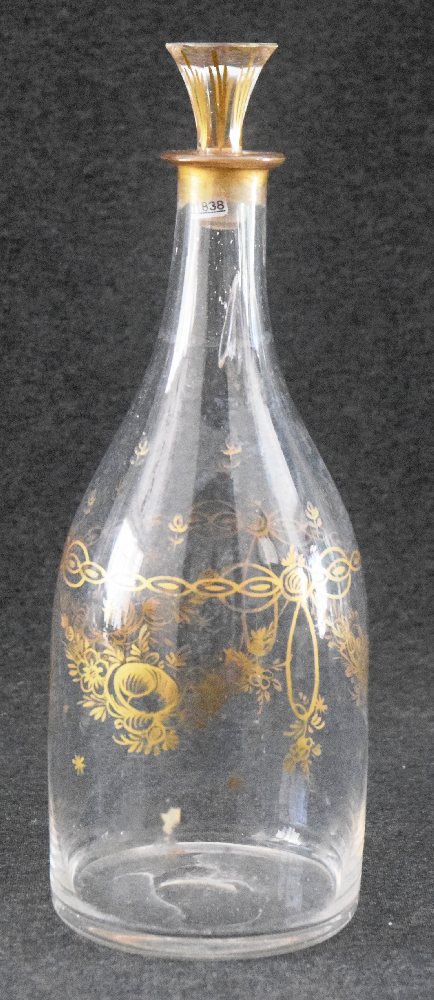19th C. Bohemian glass decanter, with stopper, gilt decoration, 30cms