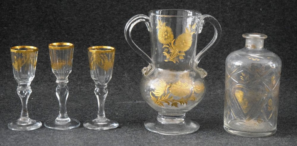 19th C. Bohemian glass 2 handle jug, small decanter and 3 liqueur stem glasses, gilt decoration