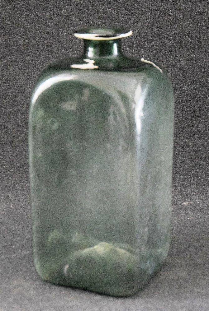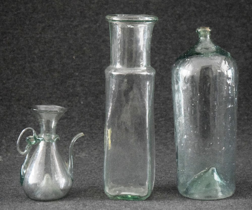 18/19th C. Green glass small square bottle, cylindrical bottle and oil bottle (3)
