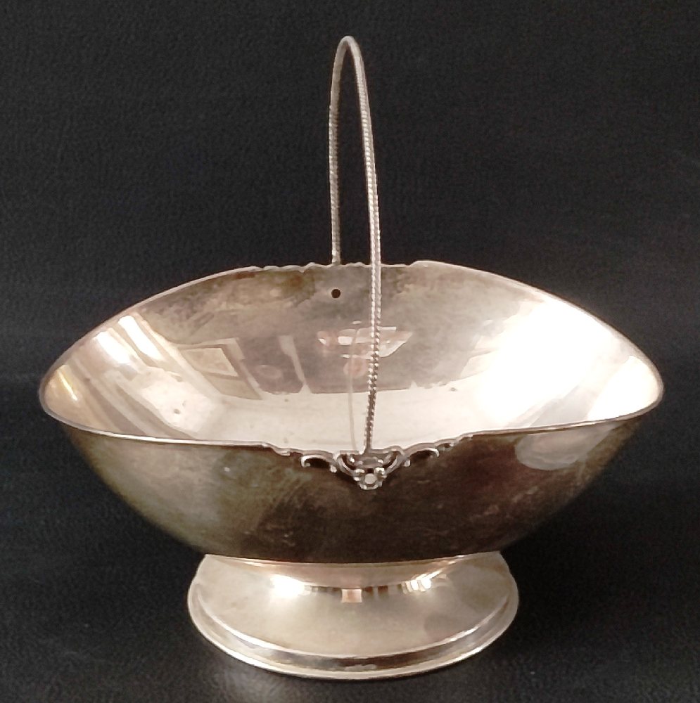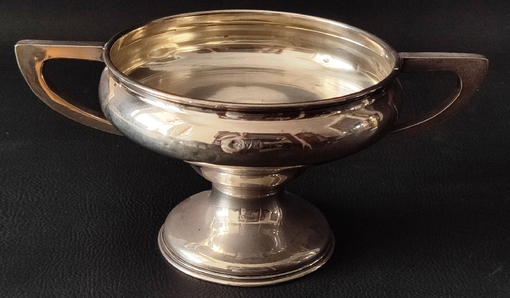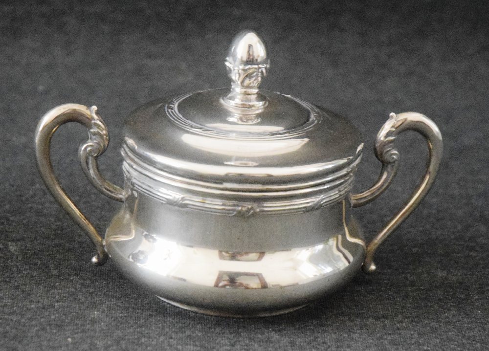 Silver 800 twin handle sugar bow with cover, white porcelain liner