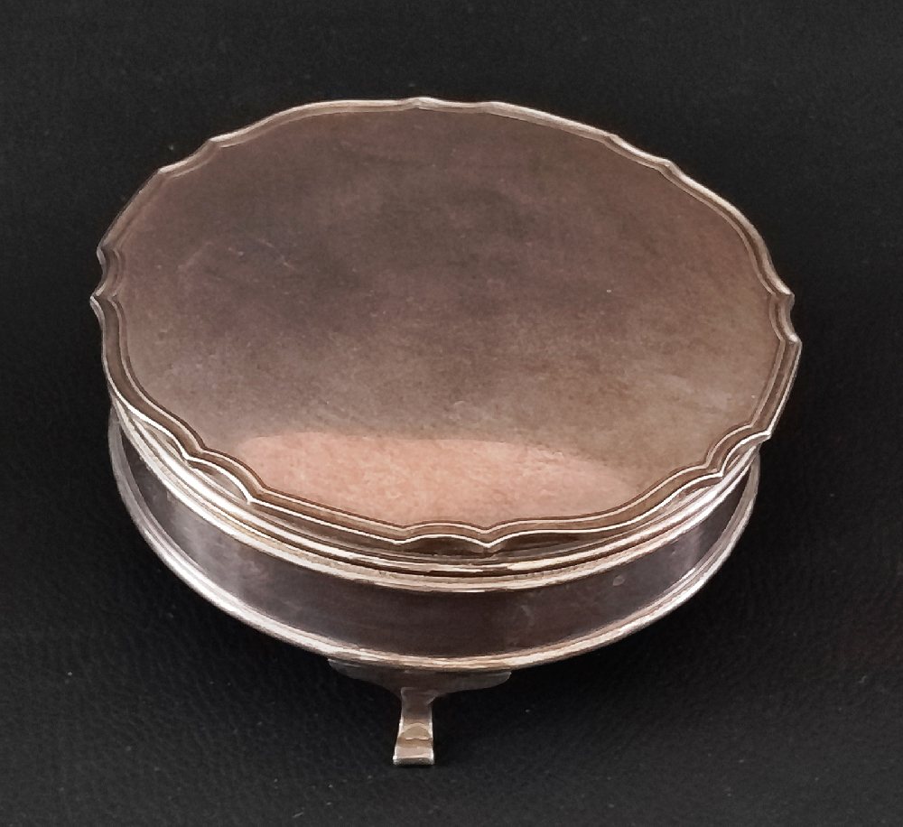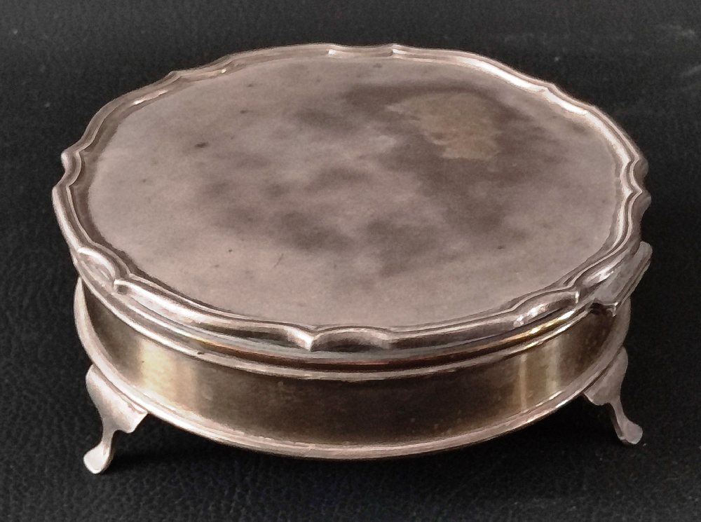 English silver round trinket box standing on 3 feet with red and gilt interior 12cms