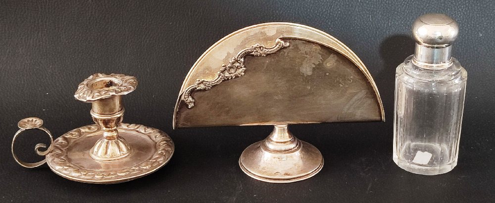 Silver napkin stand, perfume bottle and sterling silver chamber candle stick, weighted (3)