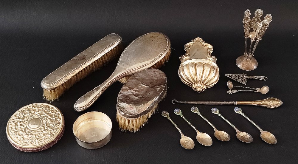 Silver hors d’oeuvre picks with holder, part dressing table set, coffee spoons, holy water font etc