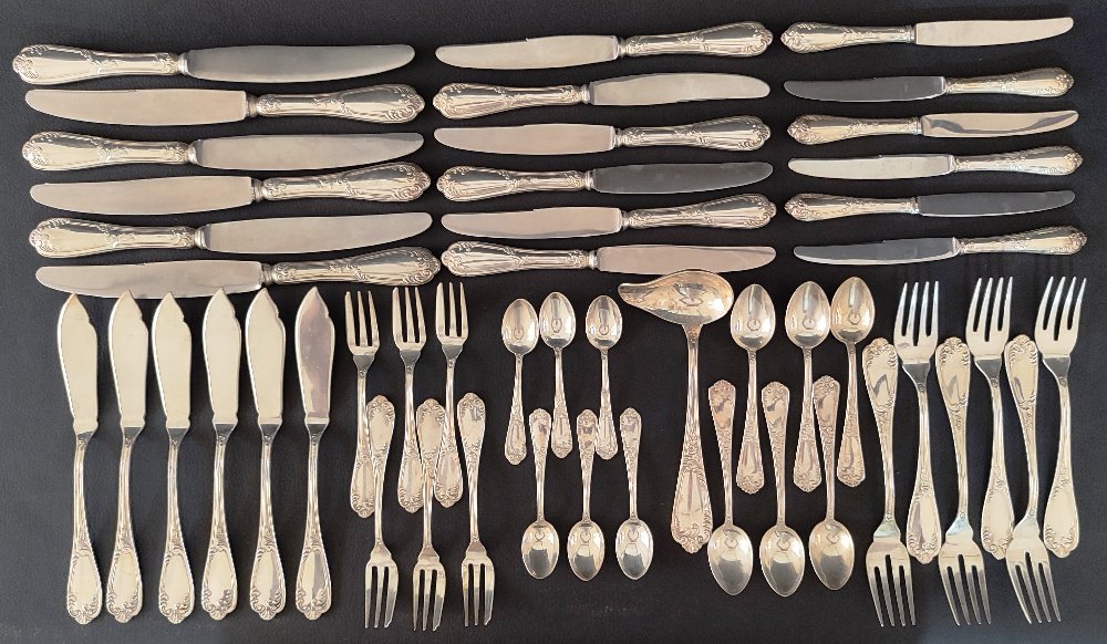 Silver 800 part canteen of cutlery, matched: 6 dessert forks, 6 forks, 6 fish knives, silver sauce ladle, 6 tea spoons and 6 coffee spoons 1115grms and 18 silver handled knives (6&6&6)