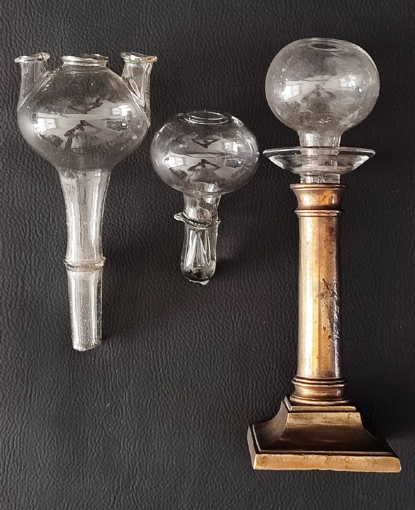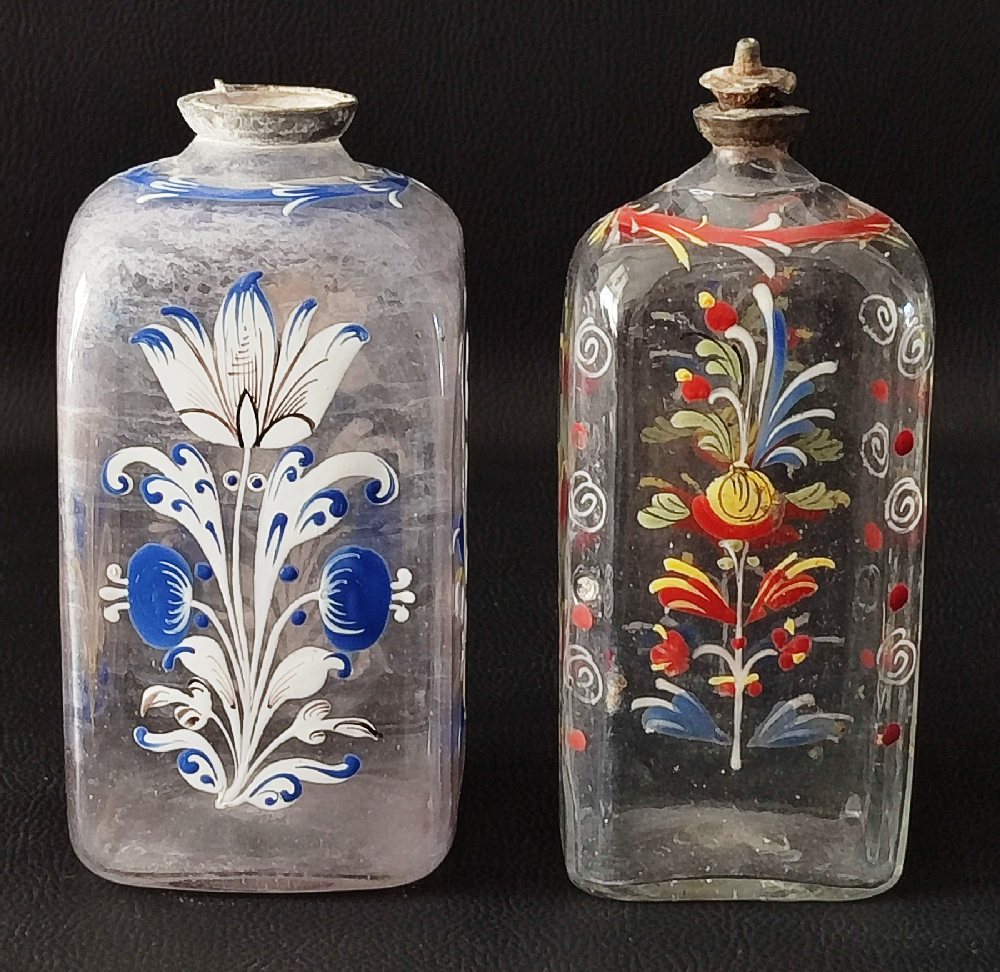 2 18/19th C. Blown glass bottles with hand painted enamel floral decorations