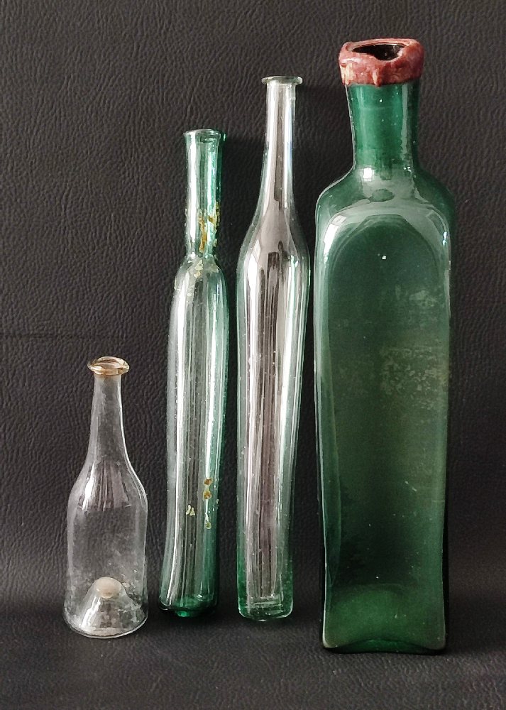 19th C. Green glass square tall bottle, 2 tall glass scent bottles and another smaller (4)
