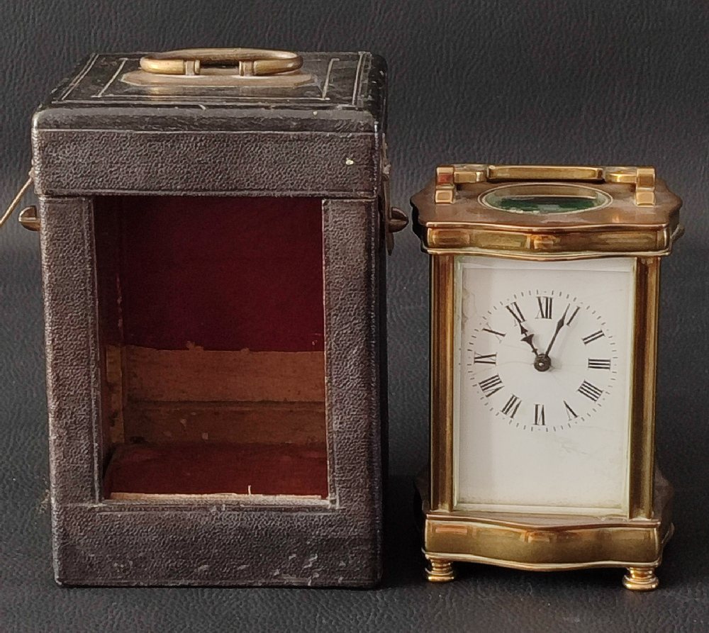 19th C. Brass case carriage clock with leather carry case