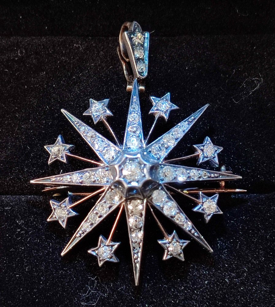 Art Deco white gold star shaped brooch pendent set with diamonds, 2.65ct, 35mm