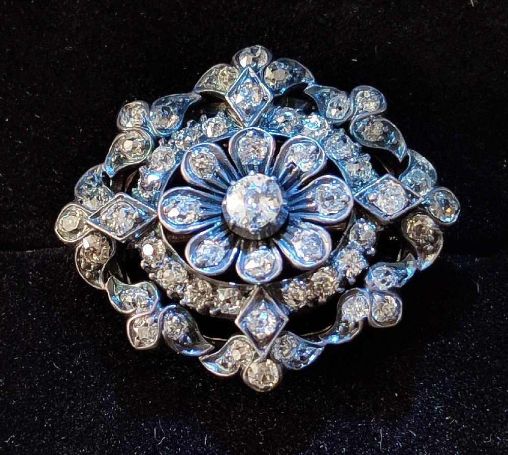 18Ct. White gold oval brooch with cut round diamonds, .65ct, 3×2.7cms