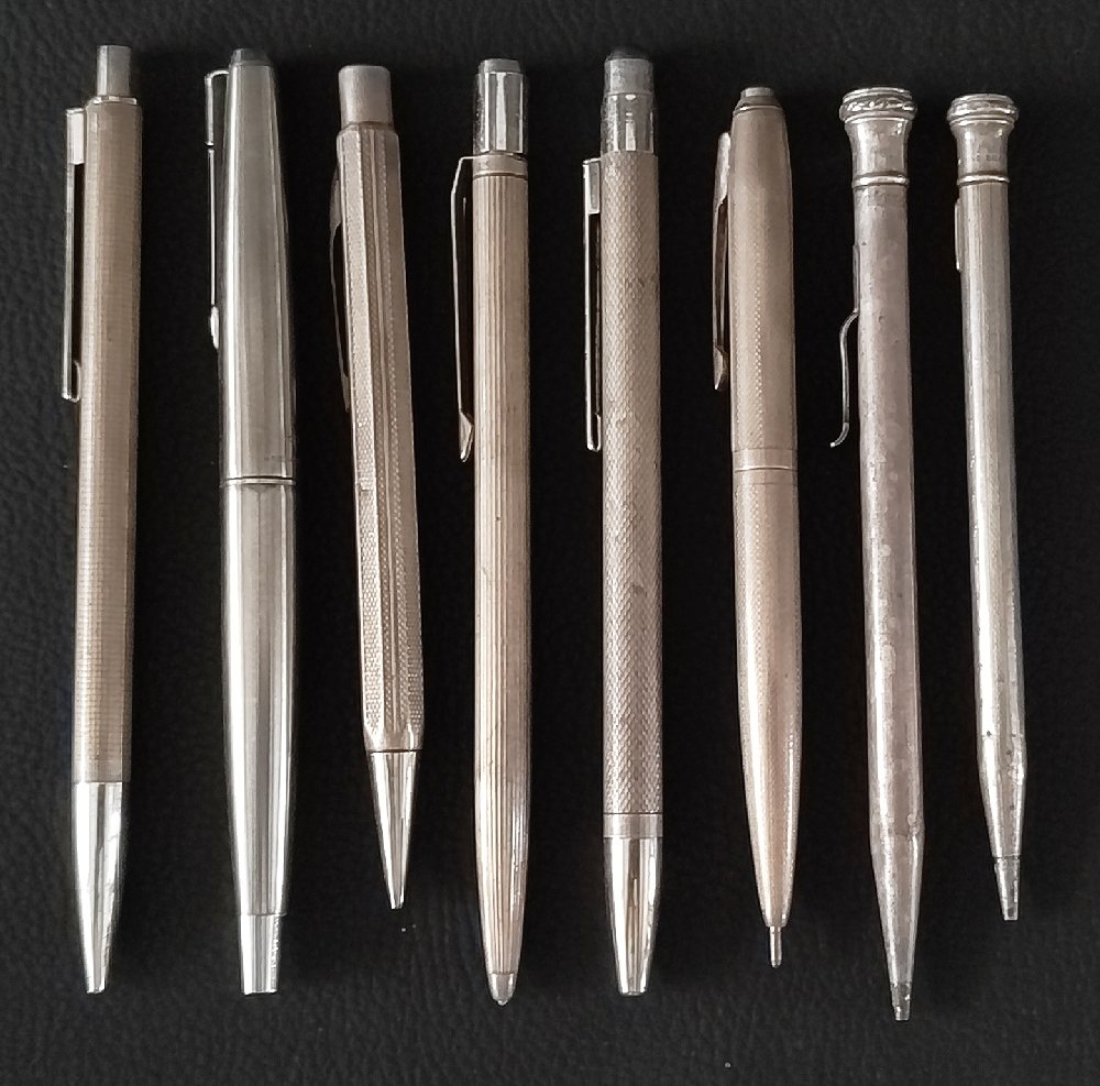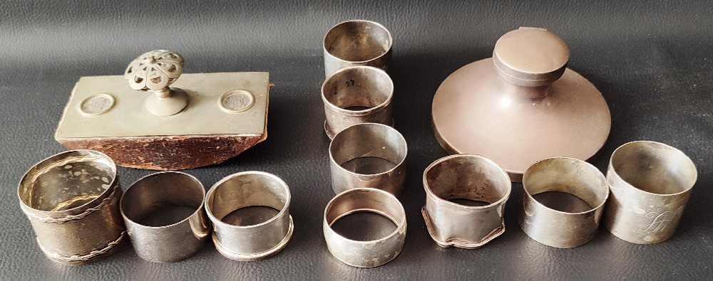 Silver ink blotter; Silver inkwell; 8 silver napkin rings and 2 others