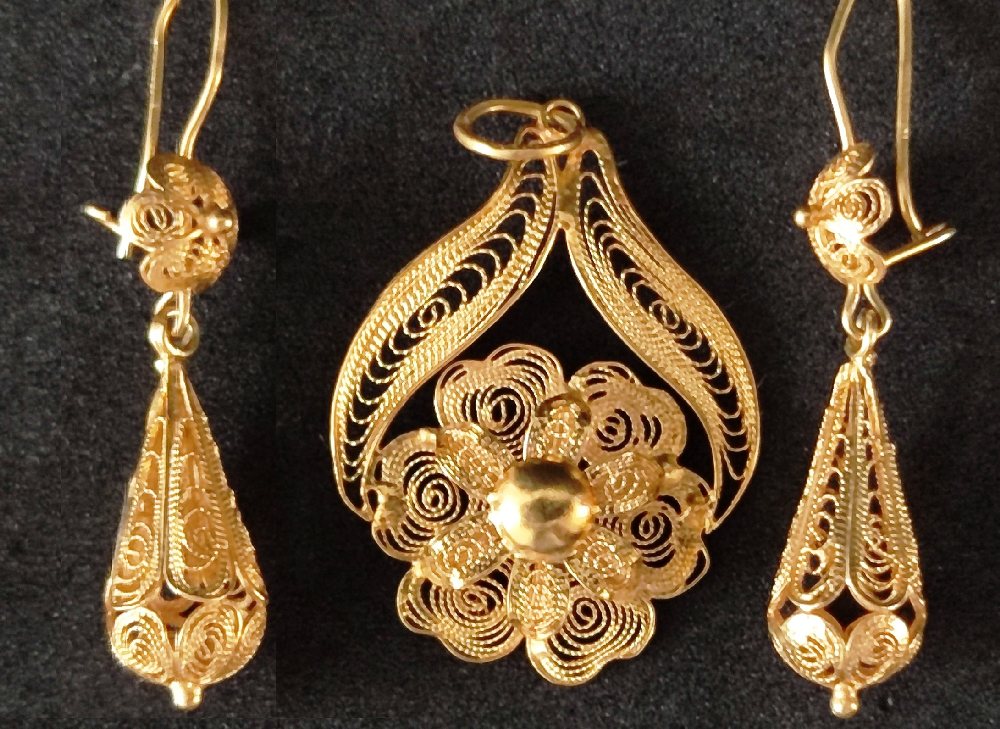 18ct Gold filigree pendent and pair ear rings, 5.35grms