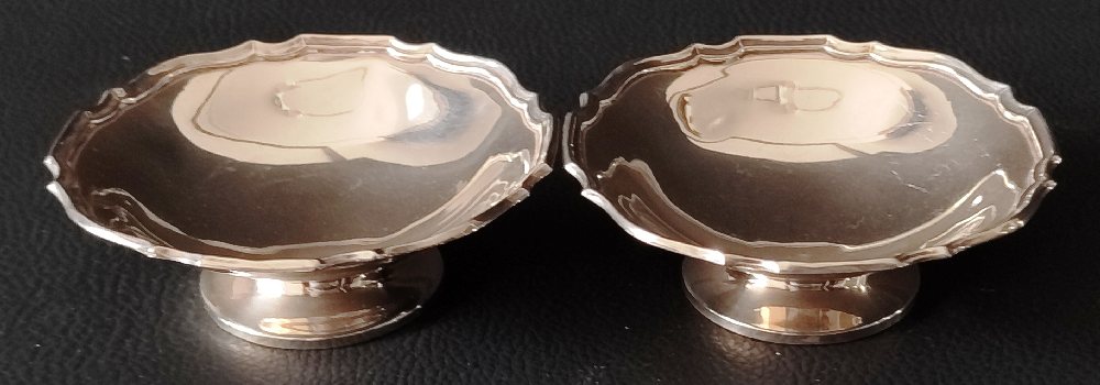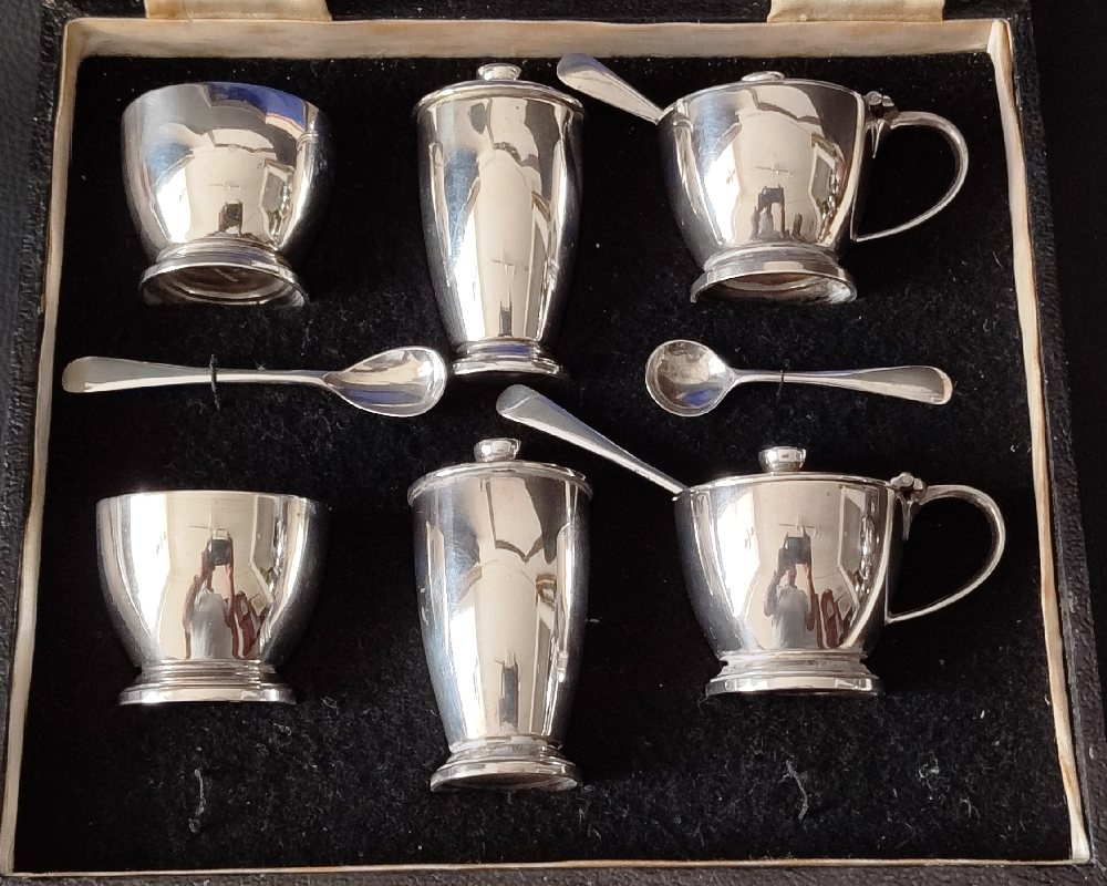 English silver double condiment set with spoons in presentation case, 280grms