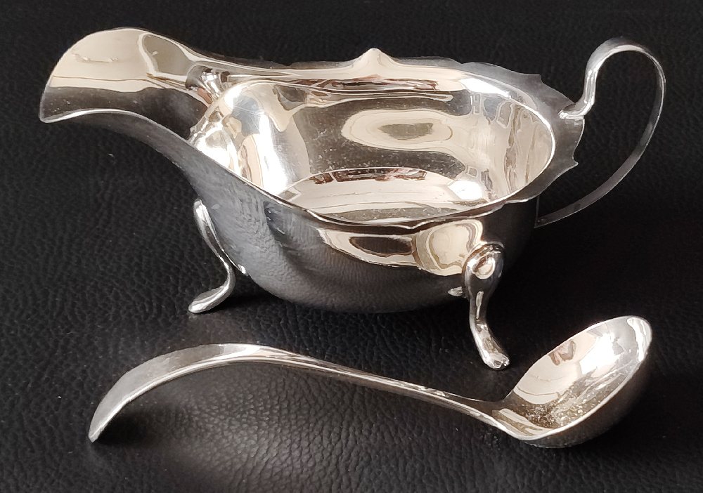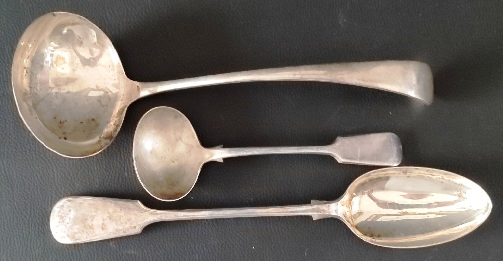 English silver fiddle pattern soup ladle, sauce ladle and rice spoon, 485grms