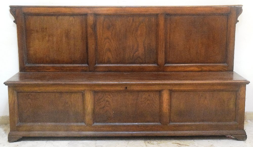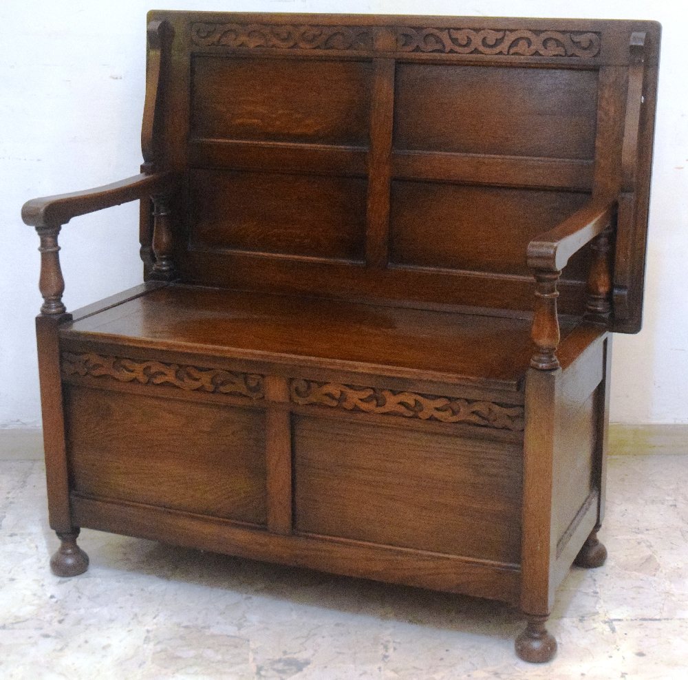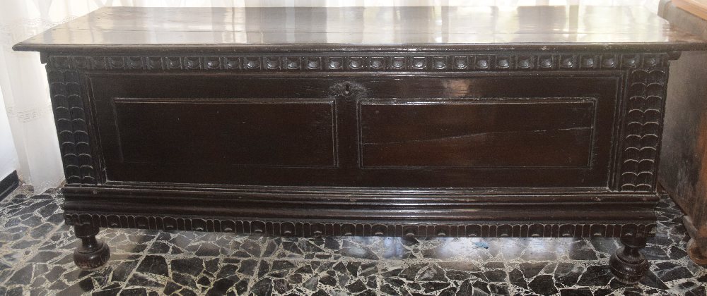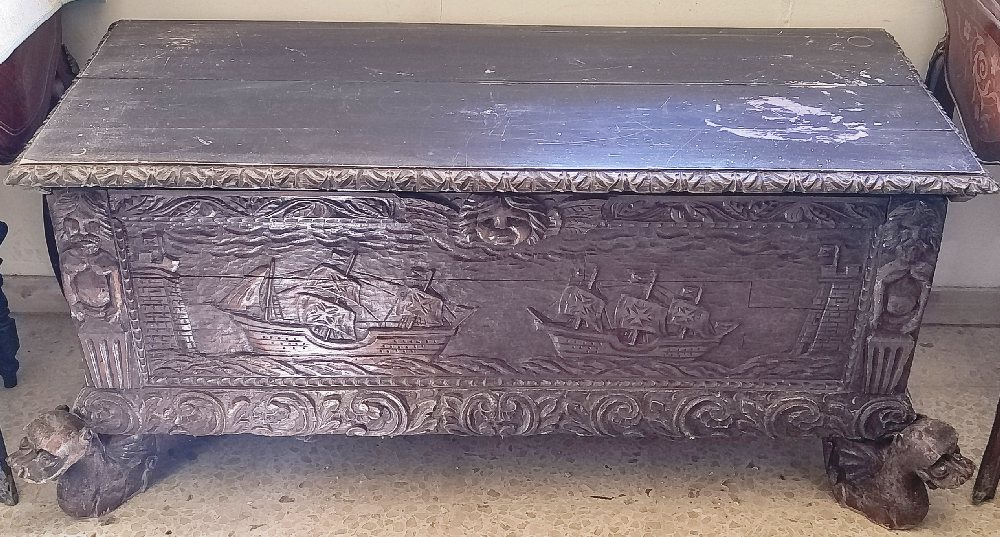 19th C. Hall coffer with grotesque front feet, and hand carved front panel with galleons
