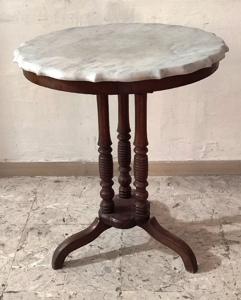 19th C. Maltese mahogany occasional table, on 3 turned columns, splay legs, white marble top