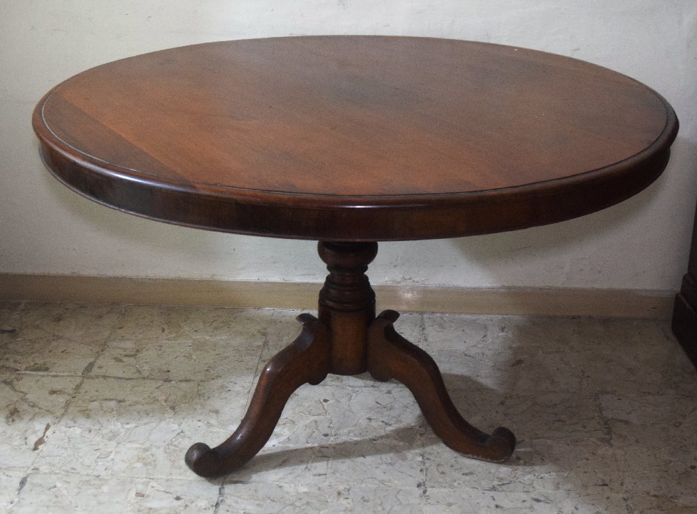 19th C. Maltese mahogany round tilt top dining table, turned column, tripod legs