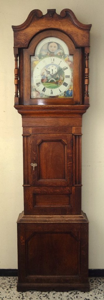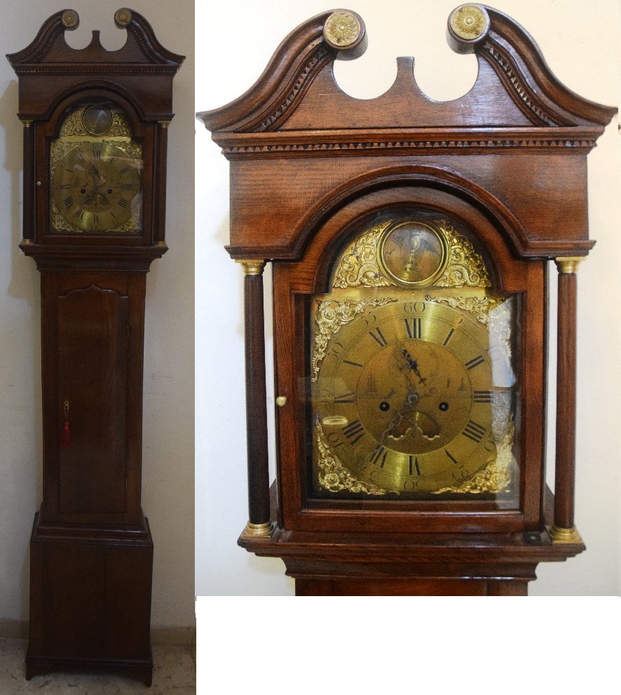 19th C. oak longcase clock, the works by Benjamin Rees Neath, Roman numerals, brass dial