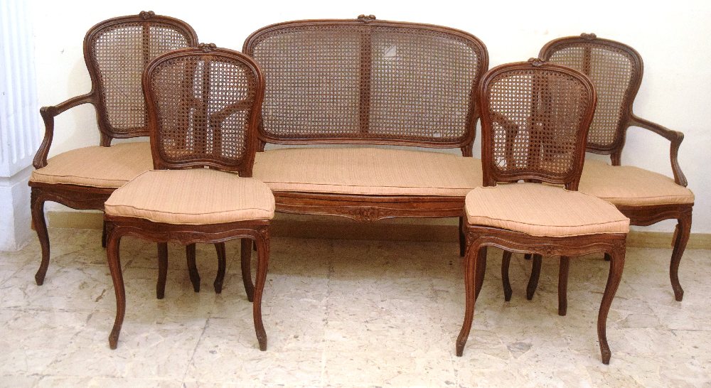 French Louis XV style walnut settee, 2 armchairs and 2 chairs with cane seats and backs