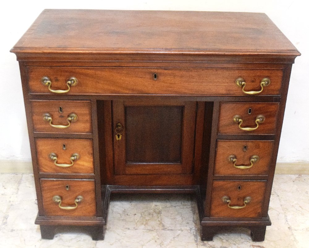 Victorian mahogany knee hole desk with string inlay top and brass handles